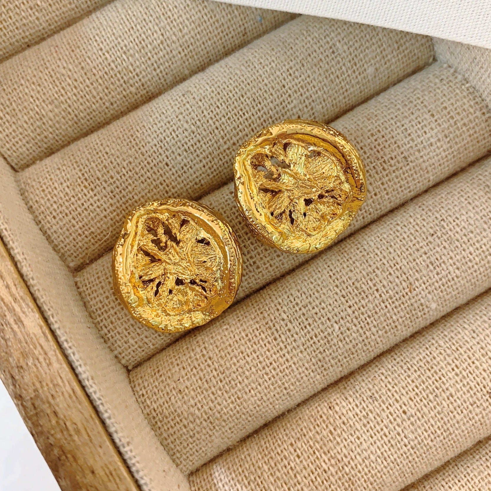 Elevate your style with our Arianna Round Earrings. Handcrafted from high-quality brass, these earrings are meticulously designed and 18K Gold-plated for a luxurious finish. Inspired by the timeless beauty of nature, the intricate patterns on the earrings reflect the elegance and grace found in every detail. Perfect for both formal occasions and everyday wear, these earrings effortlessly enhance any outfit.
