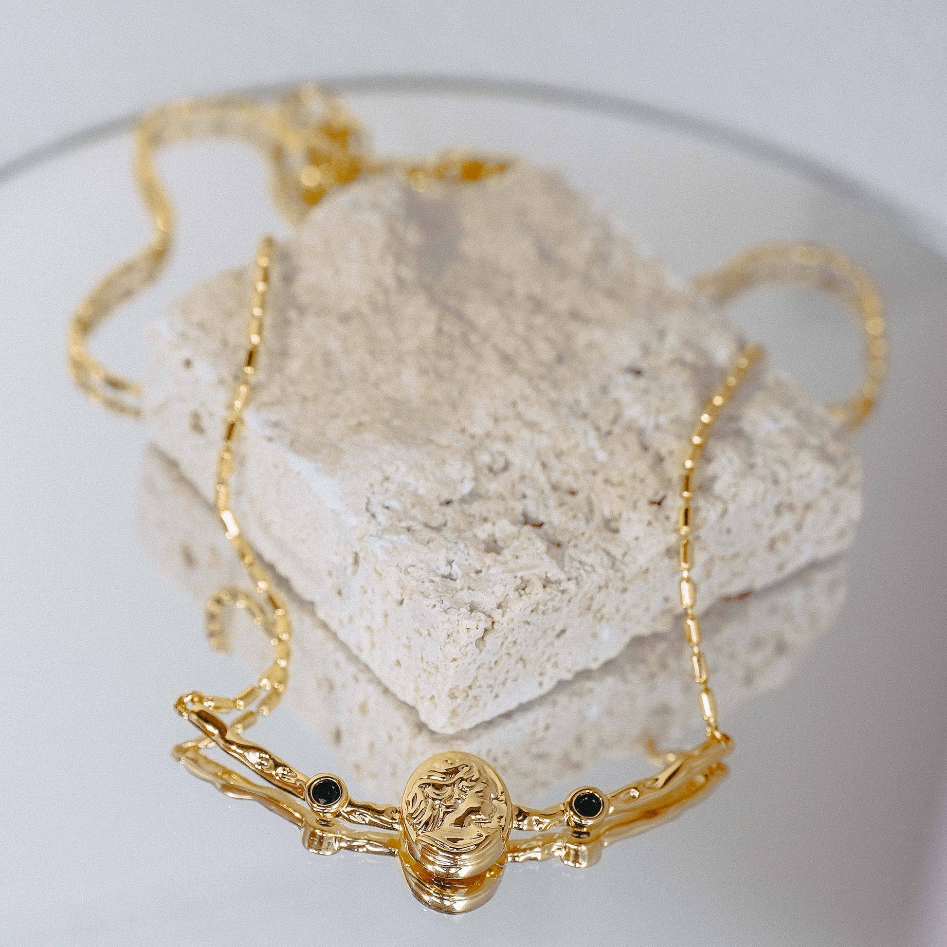 Embrace the goddess within with our Athena Necklace. This stunning necklace is made of 18k gold-plated brass and adorned with sparkling Zircon stones. Inspired by the wisdom and strength of the goddess Athena, this necklace exudes confidence and grace.