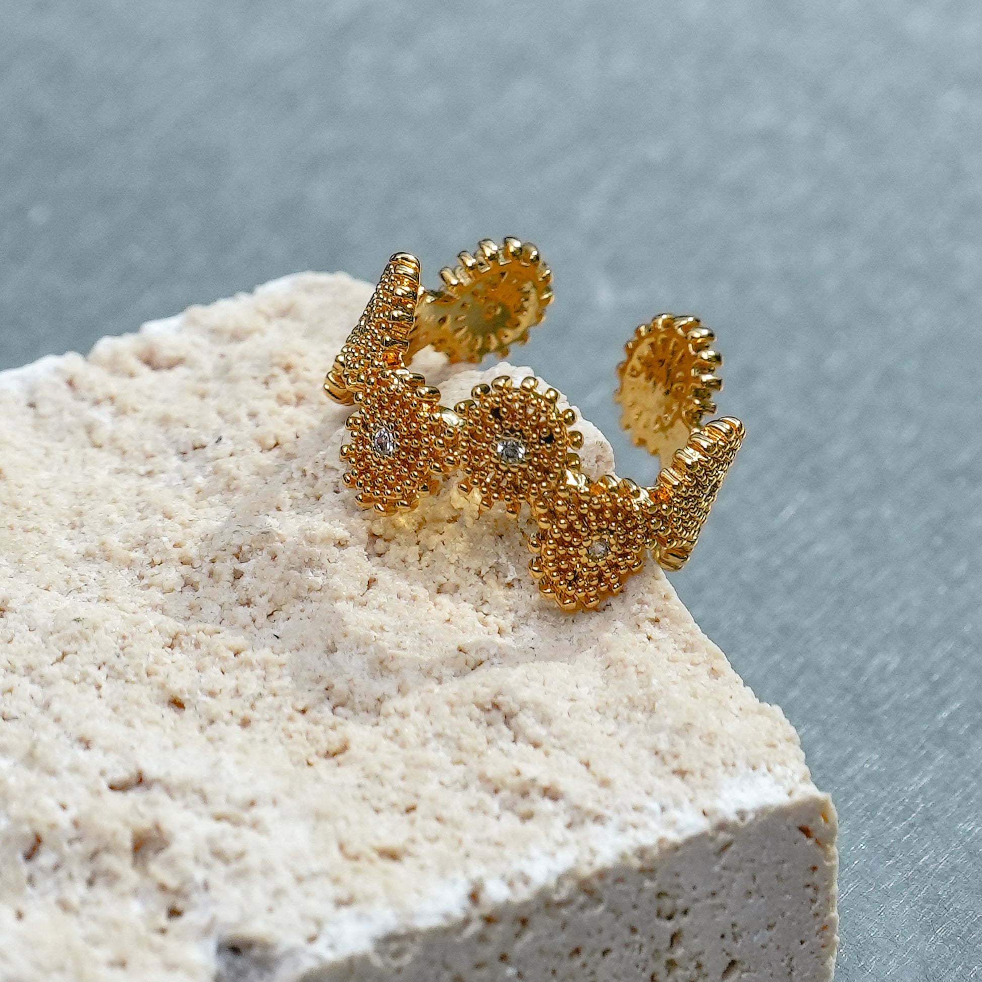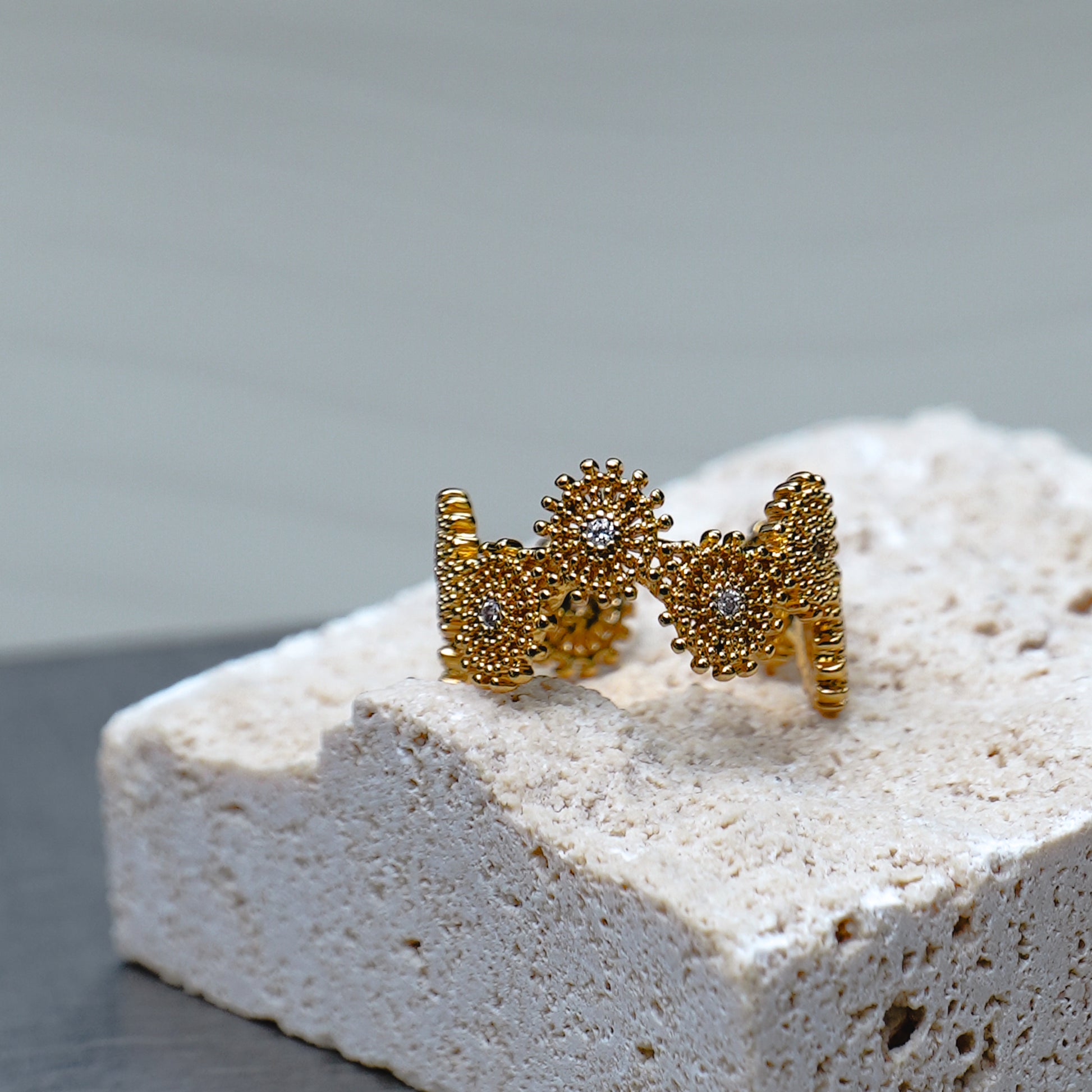 Introducing the Tulle Ring, an exquisite piece that captures the essence of refined elegance. Featuring a stunning zircon stone at its center, this ring is beautifully surrounded by a delicate band of 18k gold plated brass. The Tulle Ring is designed to add a touch of sophistication to any outfit, making it perfect for both everyday wear and special occasions.